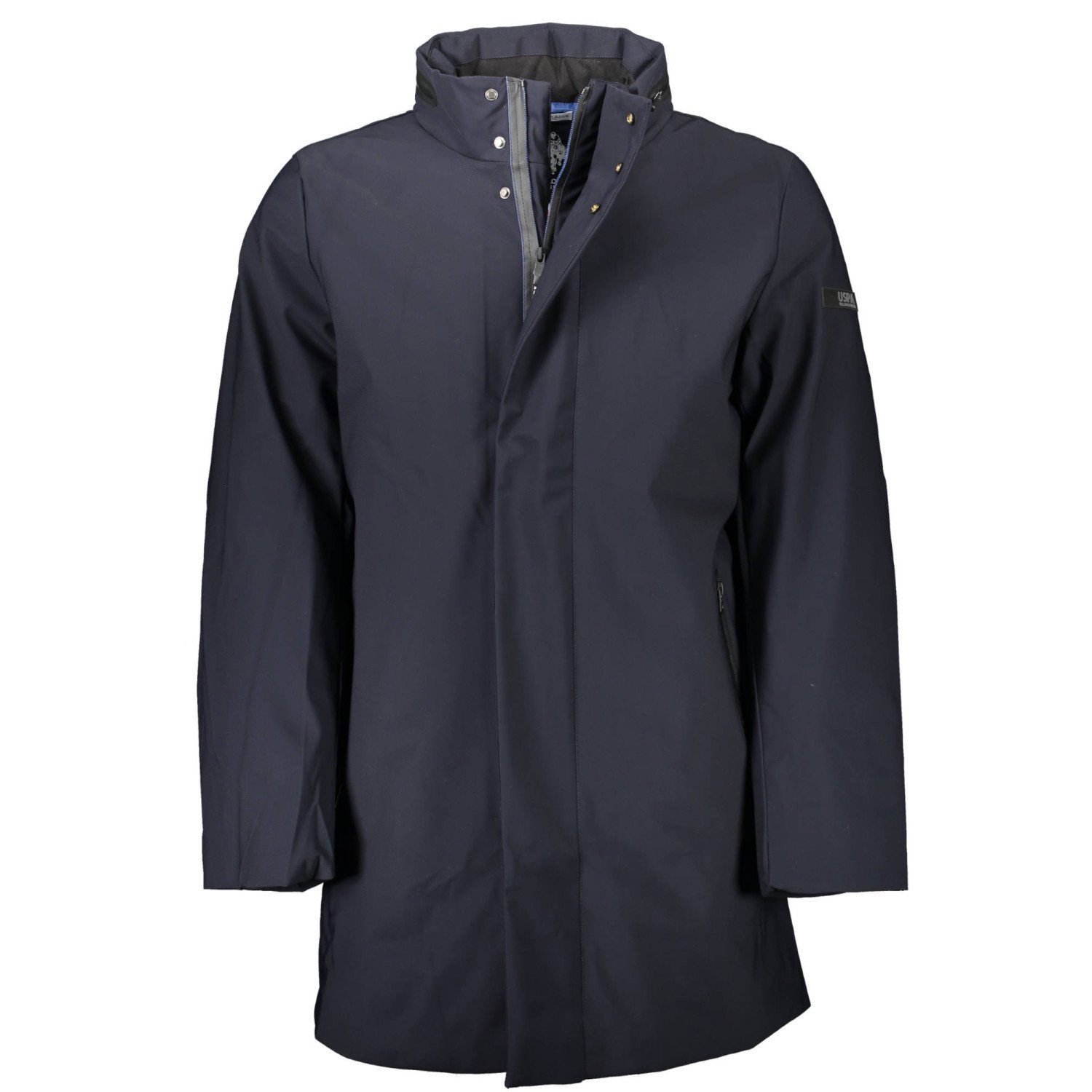 trench maniche lunghe, imbottito, impermeabile, cappuccio a scomparsa, 2 tasche esterne, 2 tasche interne, bottoni e zip, logotyp