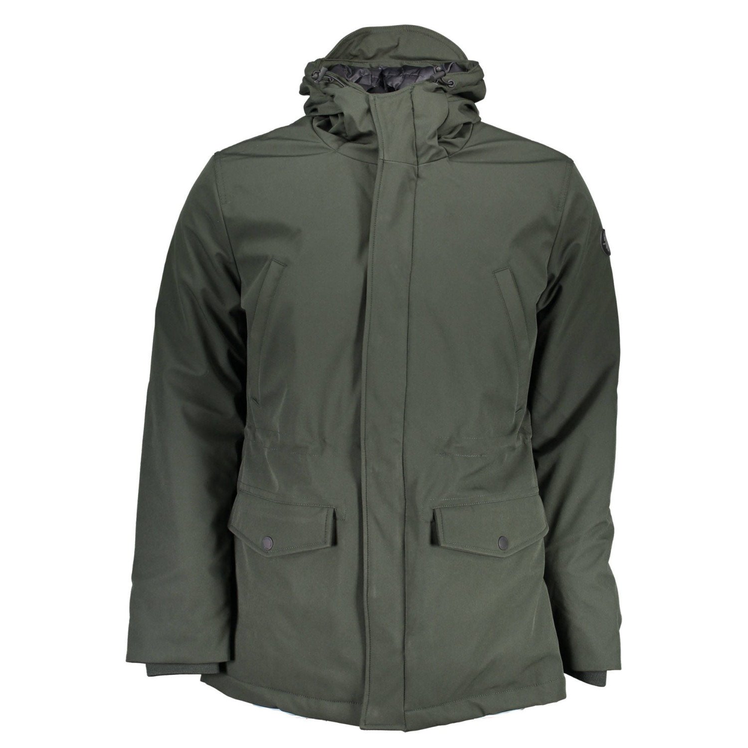 GIUBBOTTO MANICHE LUNGHE, BOTTONI E ZIP, 4 TASCHE ESTERNE, 1 TASCA INTERNA, CAPPUCCIO, LOGO