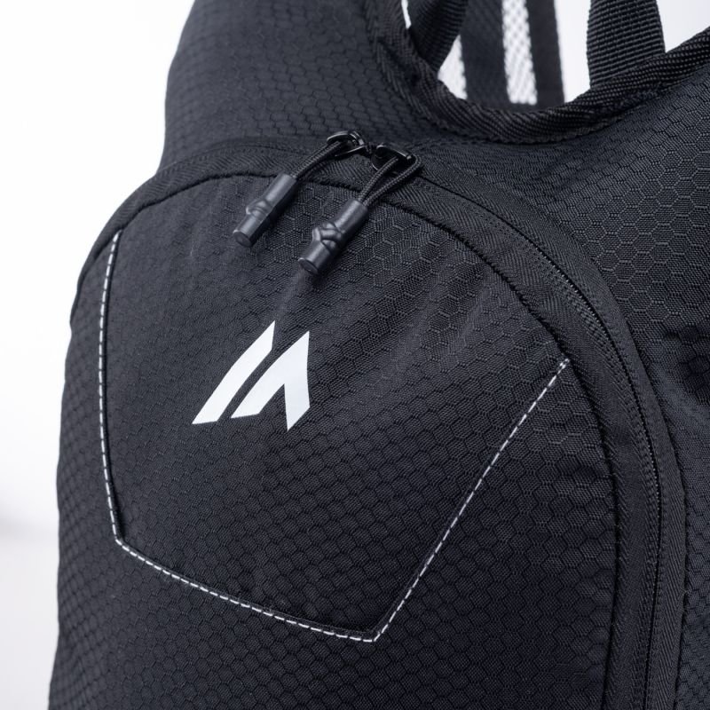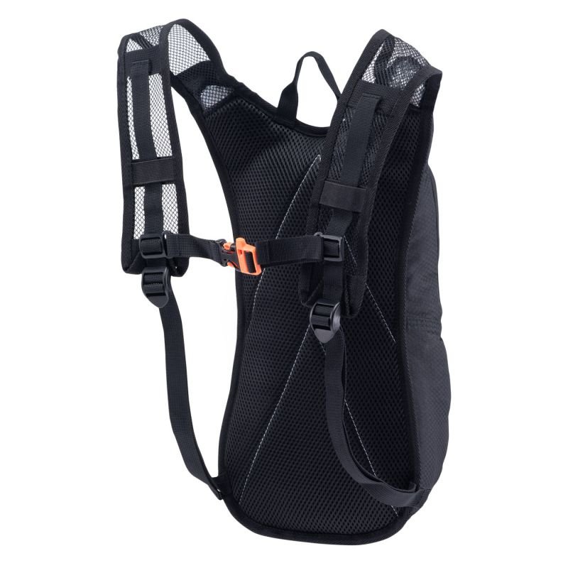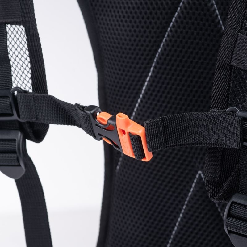 Nätkonstruktionen i rygg- och axelremmarna underlättar bättre fukttransport och snabbare torkning. En visselpipa inbyggd i bröstremmen och reflexelement förbättrar din säkerhet på vägen.
